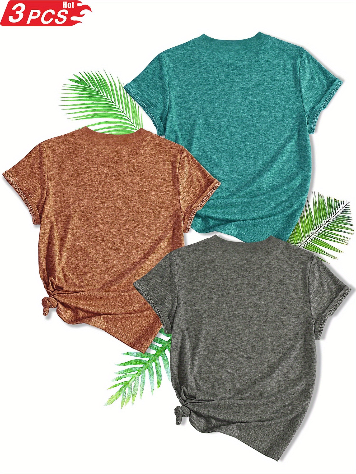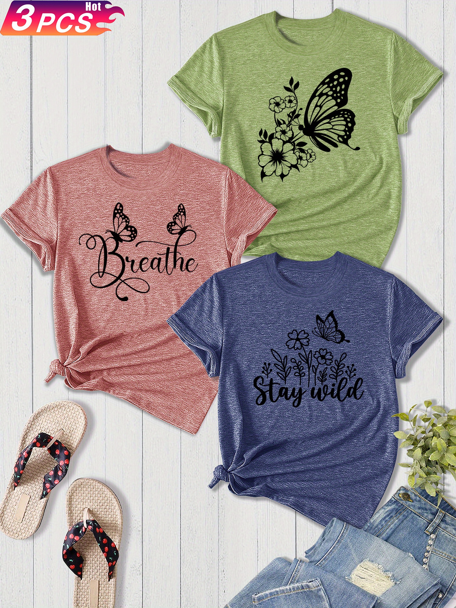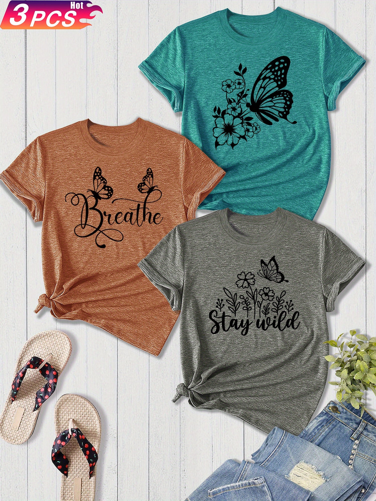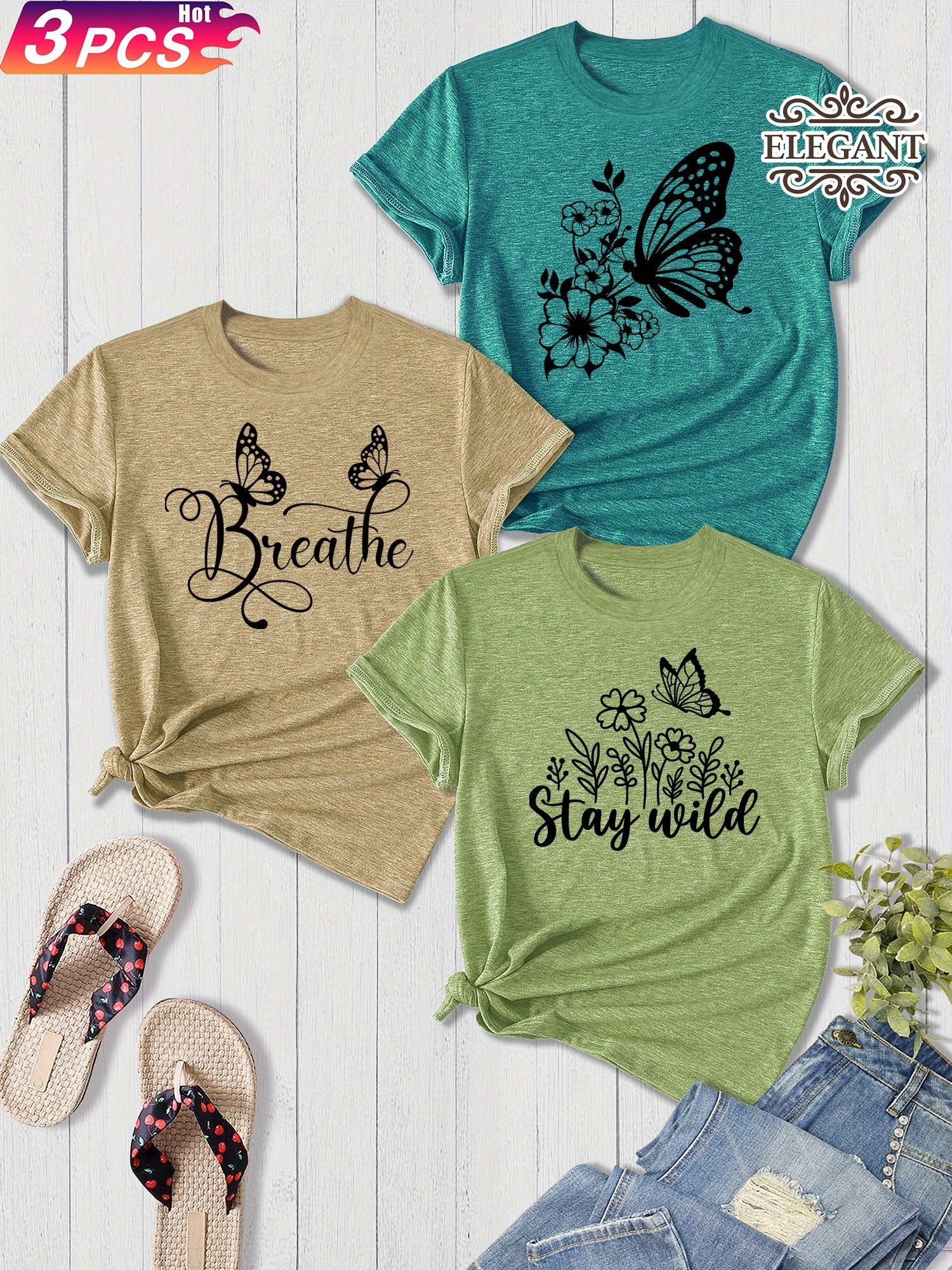 3-Pack Women'S Sister Family Clothing Summer Refreshing Day Retro Simple Elegant Butterfly Flower English Alphabet Printing Sports T-Shirt, Casual Crew Neck Short-Sleeved Top, Shot Polyester Blend, Perfect Choice for Gifts, Summer And Spring Clothing