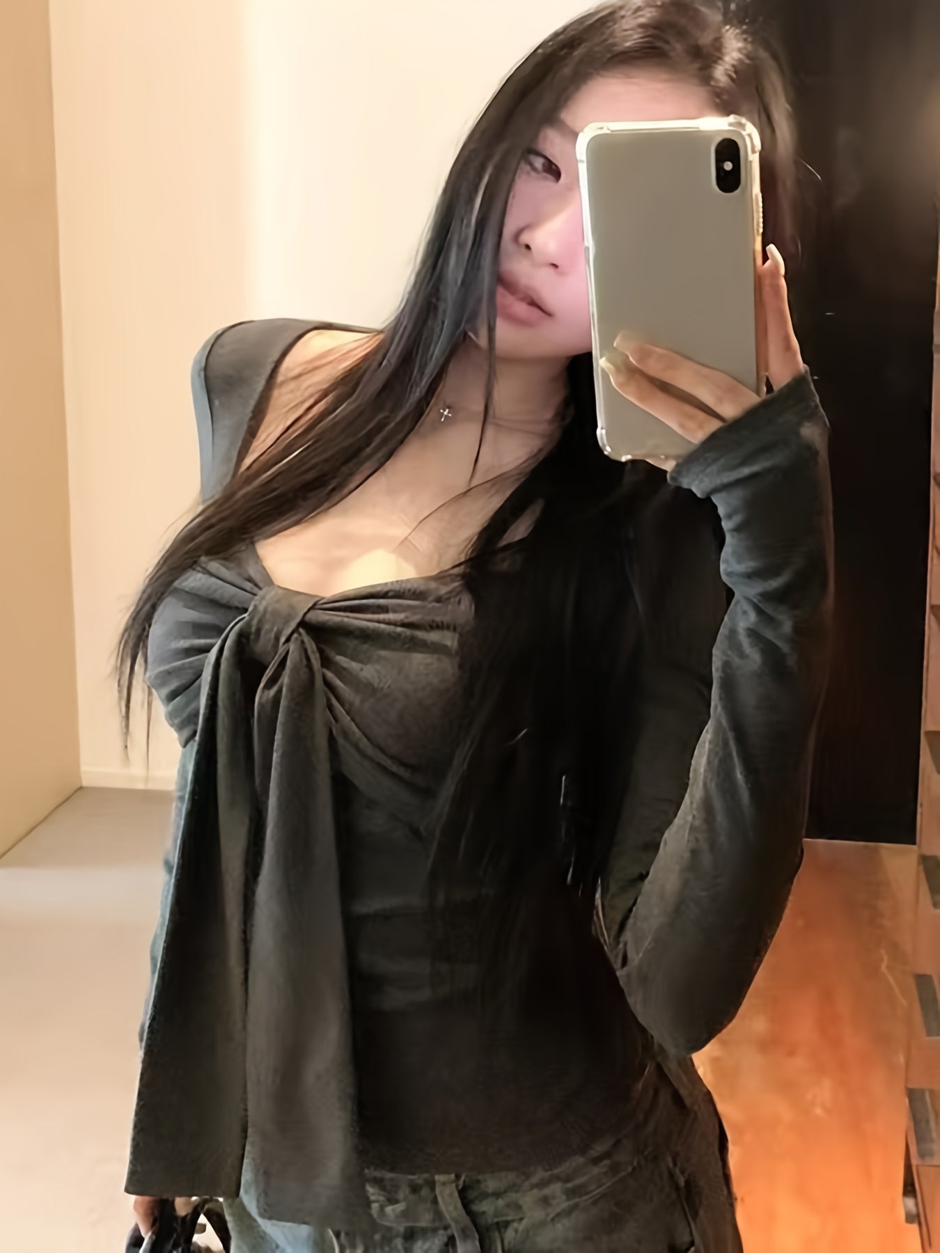 Chic French-Inspired Bow Tie Long Sleeve Crop Top for Women - Slim Fit, Ruched Design, Soft & Stylish, Perfect for Spring\u002FFall, Solid Color, Versatile Layering Piece, Autumn Chic Top | Chic Long Sleeve Top | Ruched Detailing