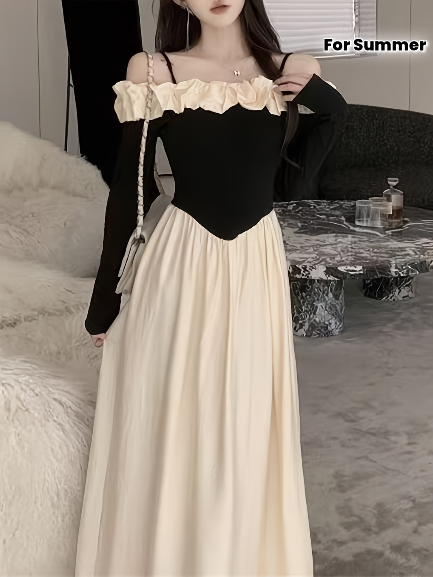Cute Polyester Dress Polyester Off-the-Shoulder Long Sleeve Dress | Cute Exaggerated Ruffle and Fit and Flare Silhouette - Perfect for Adult Spring\u002FSummer\u002FFall