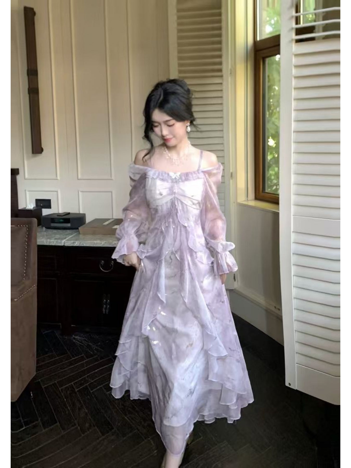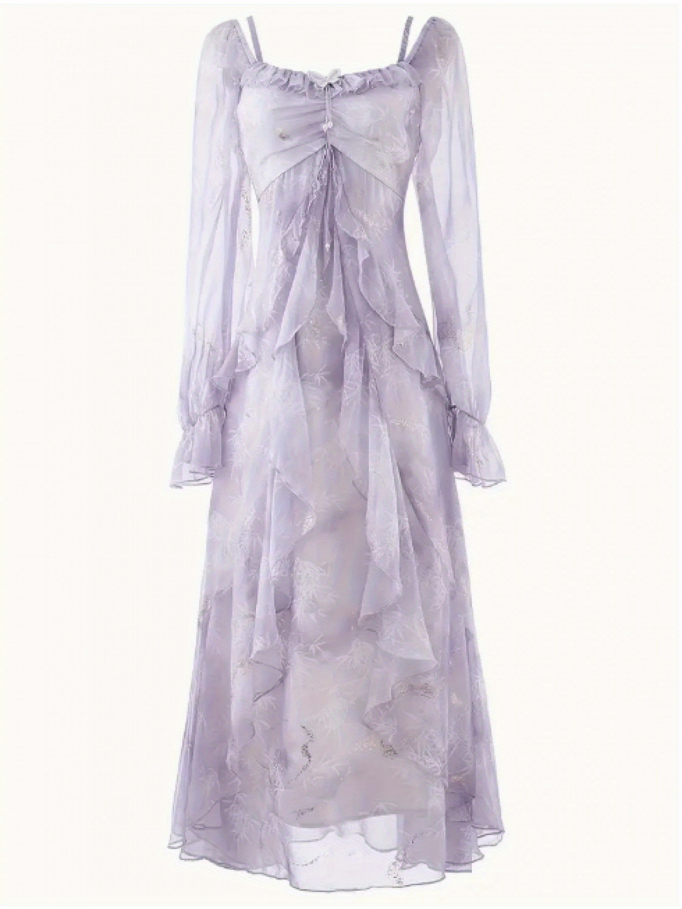 Elegant Gray-Blue Ombre Ruffled Long Sleeve Dress with Princess Sleeves & Square Neckline - Bodycon Floor-Length Summer Dress for Women, Machine Washable