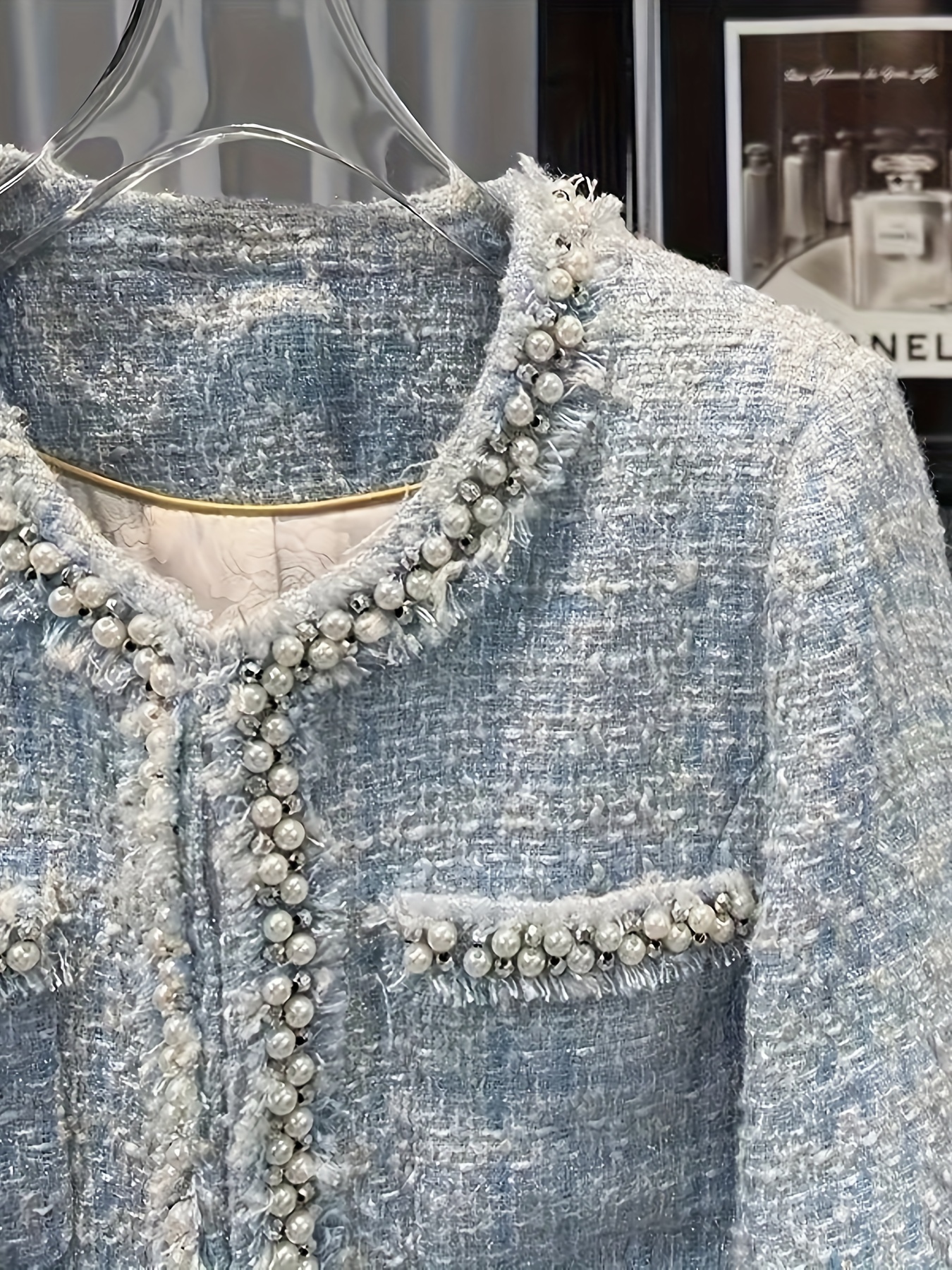 New Blue Round-Neck Jacket, French Style, Embellished with Handcrafted Beads, Versatile And Stylish Top, Model 220886-5.