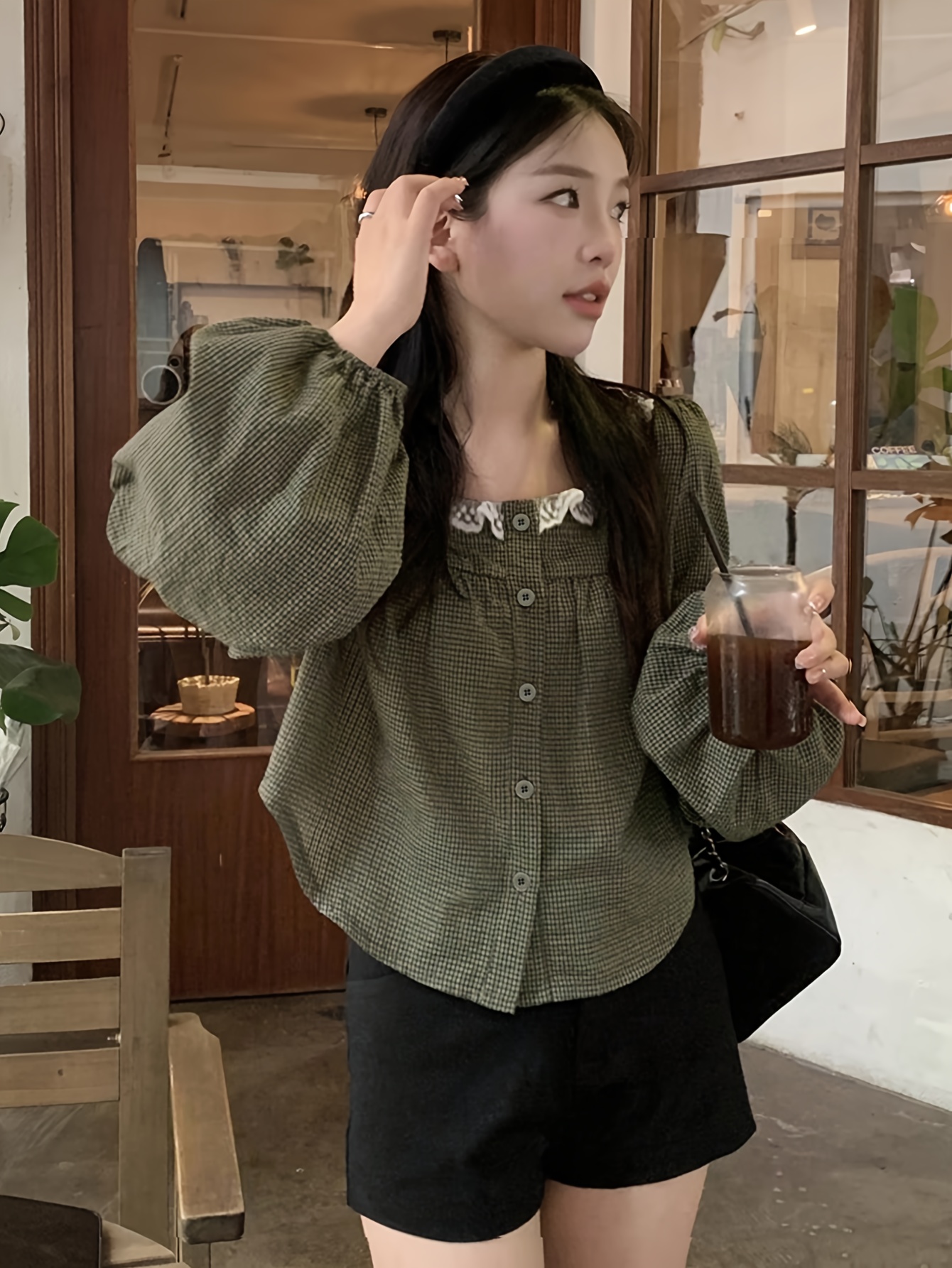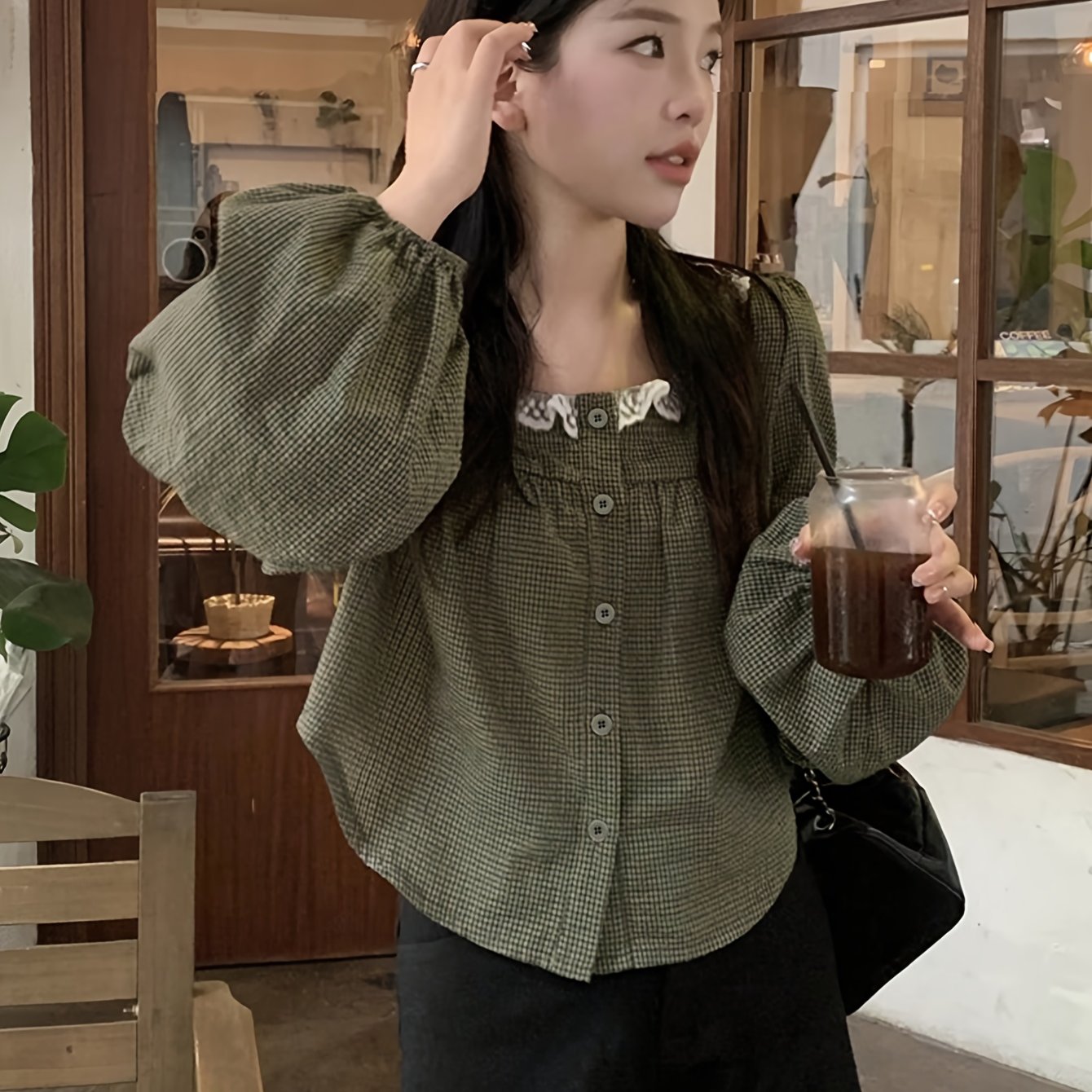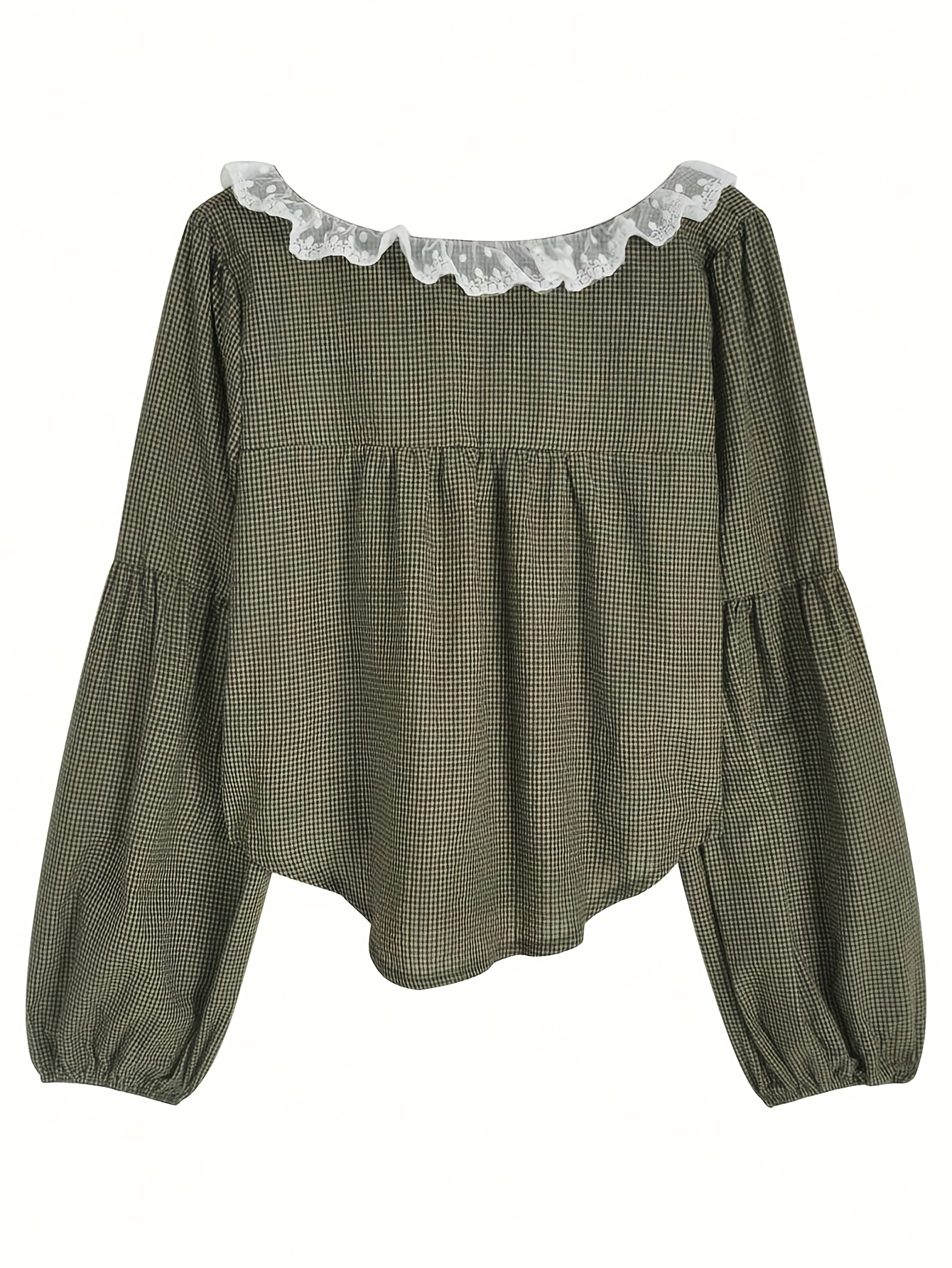Vintage Plaid Square Neck Top with Sweet Contrast Lace Inserts for Spring, Summer and Autumn Women's Shirt