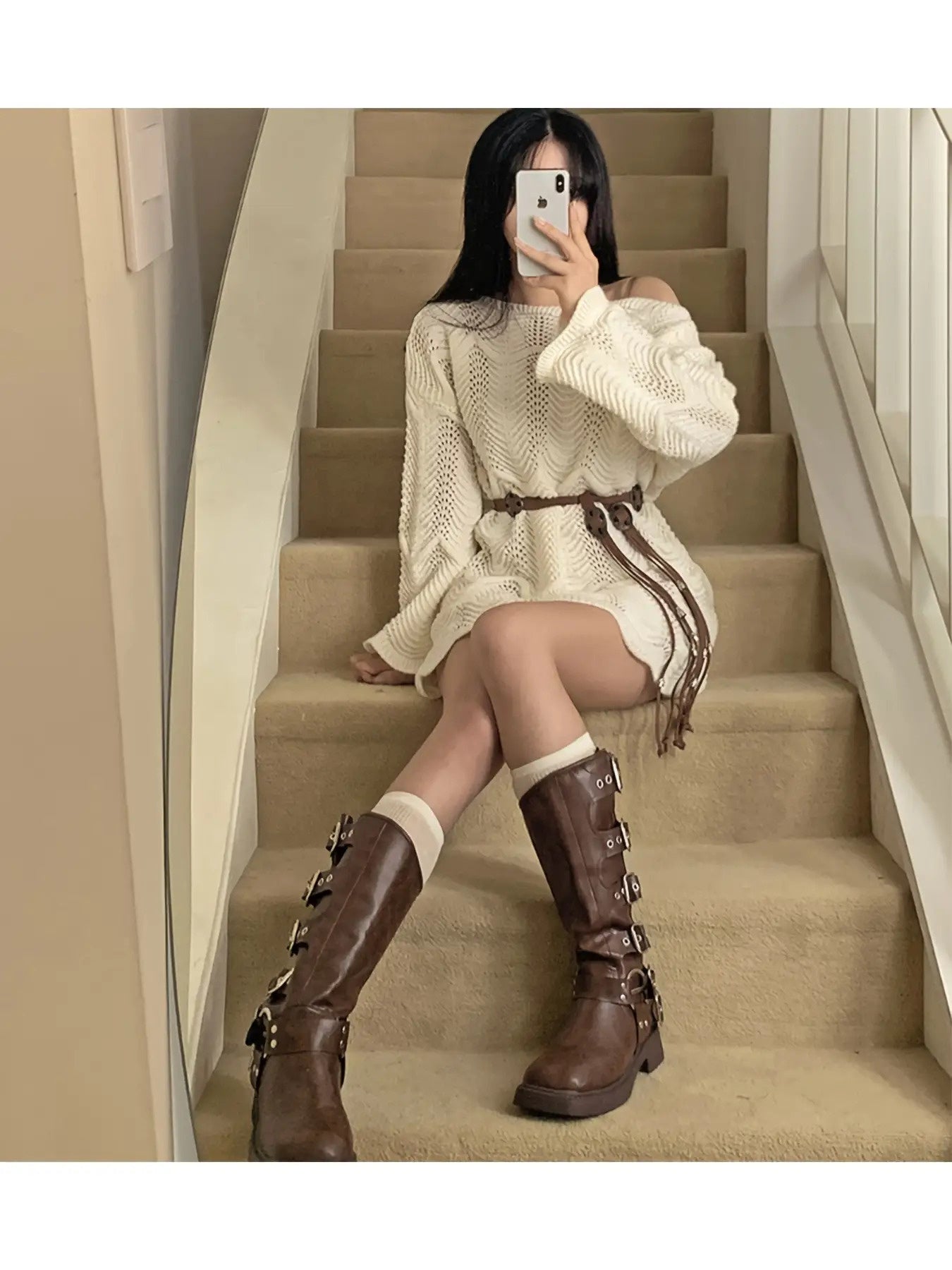 Women's Asymmetric Shoulder Design Loose Versatile Dress with Belt TJ22729