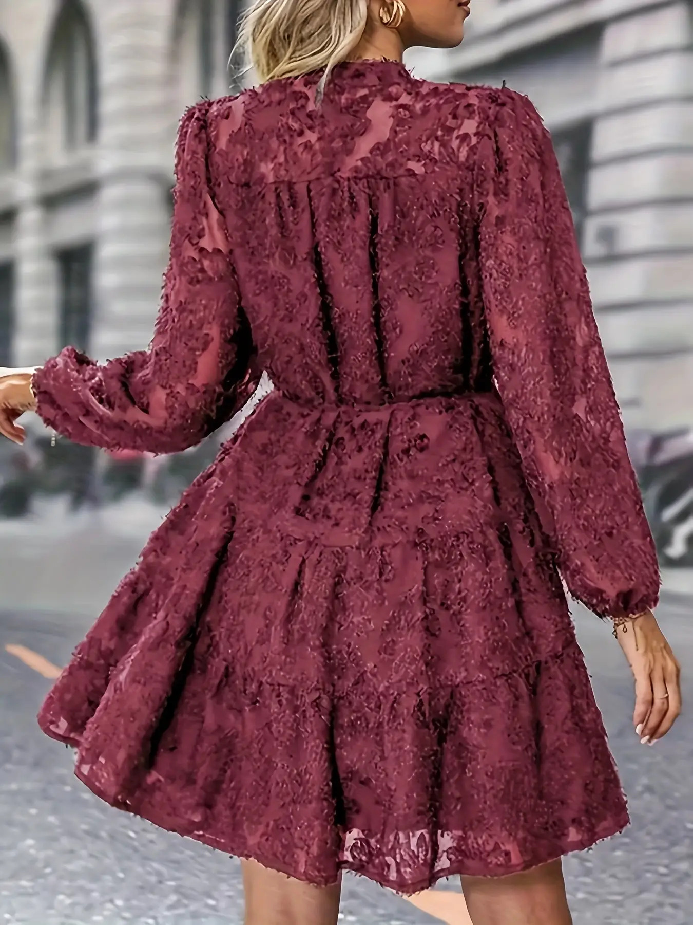 Women's Elegant Burgundy Off-Shoulder\u002FBoat Neck Long Sleeve Mini Dress - A-Line Fitted Short Cocktail Party Wedding Guest Dress, All-Season Frock with Short (No) for Year-Round Wear, Machine Washable