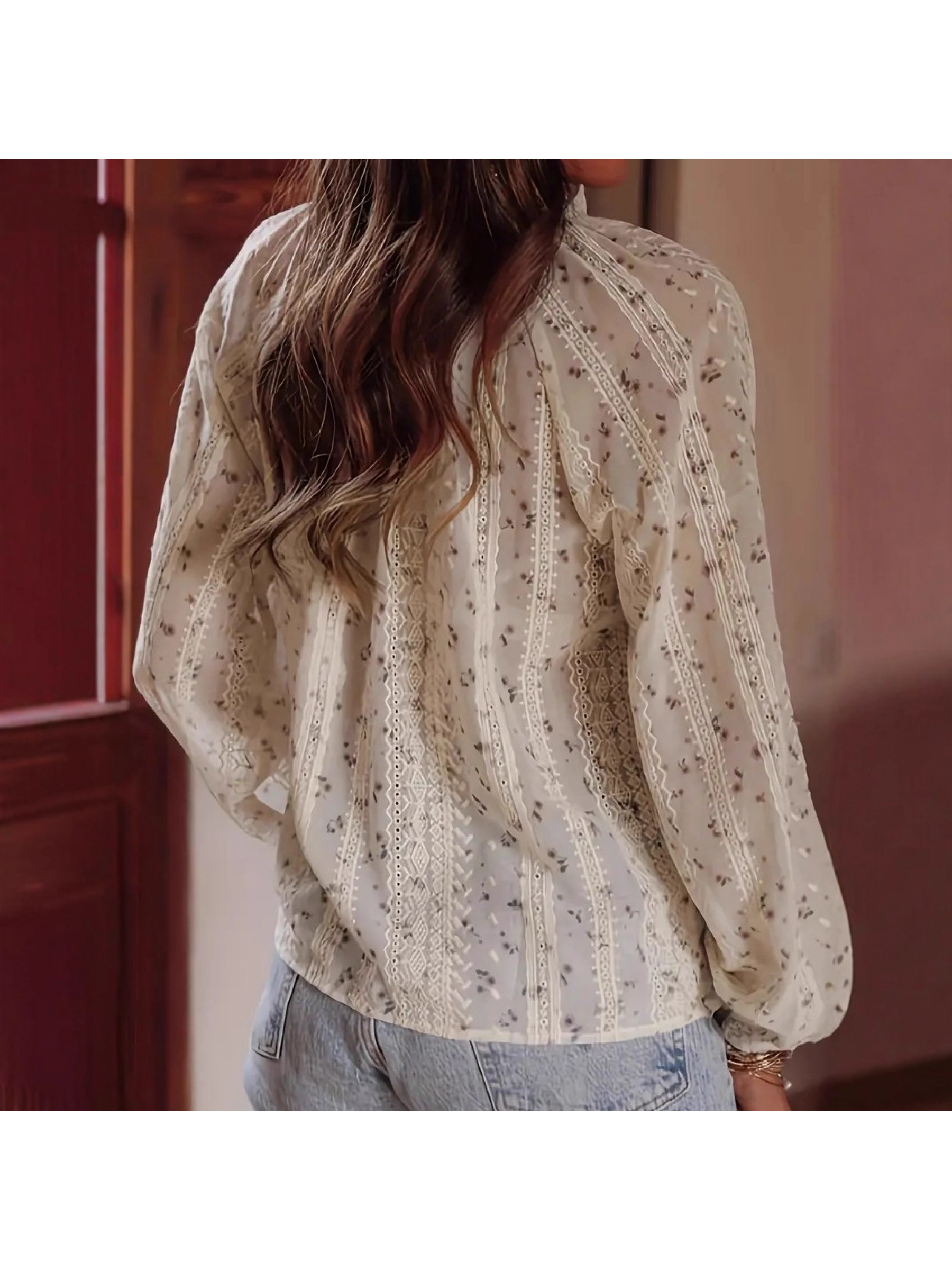Women's Elegant Floral Lace Blouse with Puff Sleeves & - Boho-Chic White Shirt Jacket-like Button-Front Top, Bell Sleeves & Fringe Hem, Machine Washable Loose Fit for Spring\u002FFall (Casual to Wedding Events)