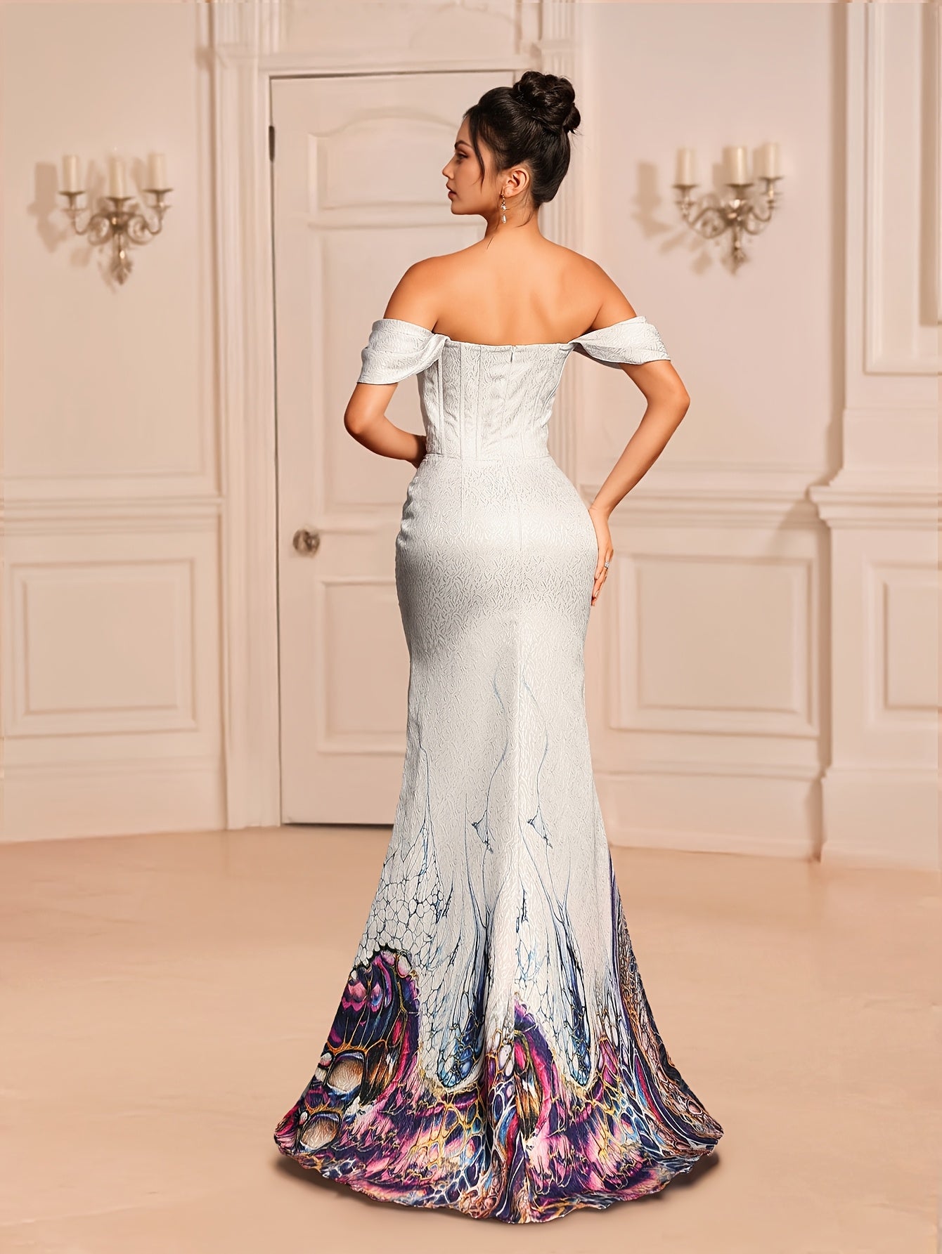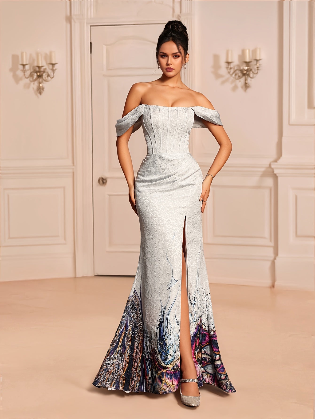 Women's Elegant Off-the-Shoulder Evening Gown with High Slit & Mermaid Silhouette - Long Sleeveless Formal Dress, Fishbone Corset Waist, A-Line Cut for Weddings, Galas & Black-Tie Events, Wedding Guest Attire, Sophisticated Detailing