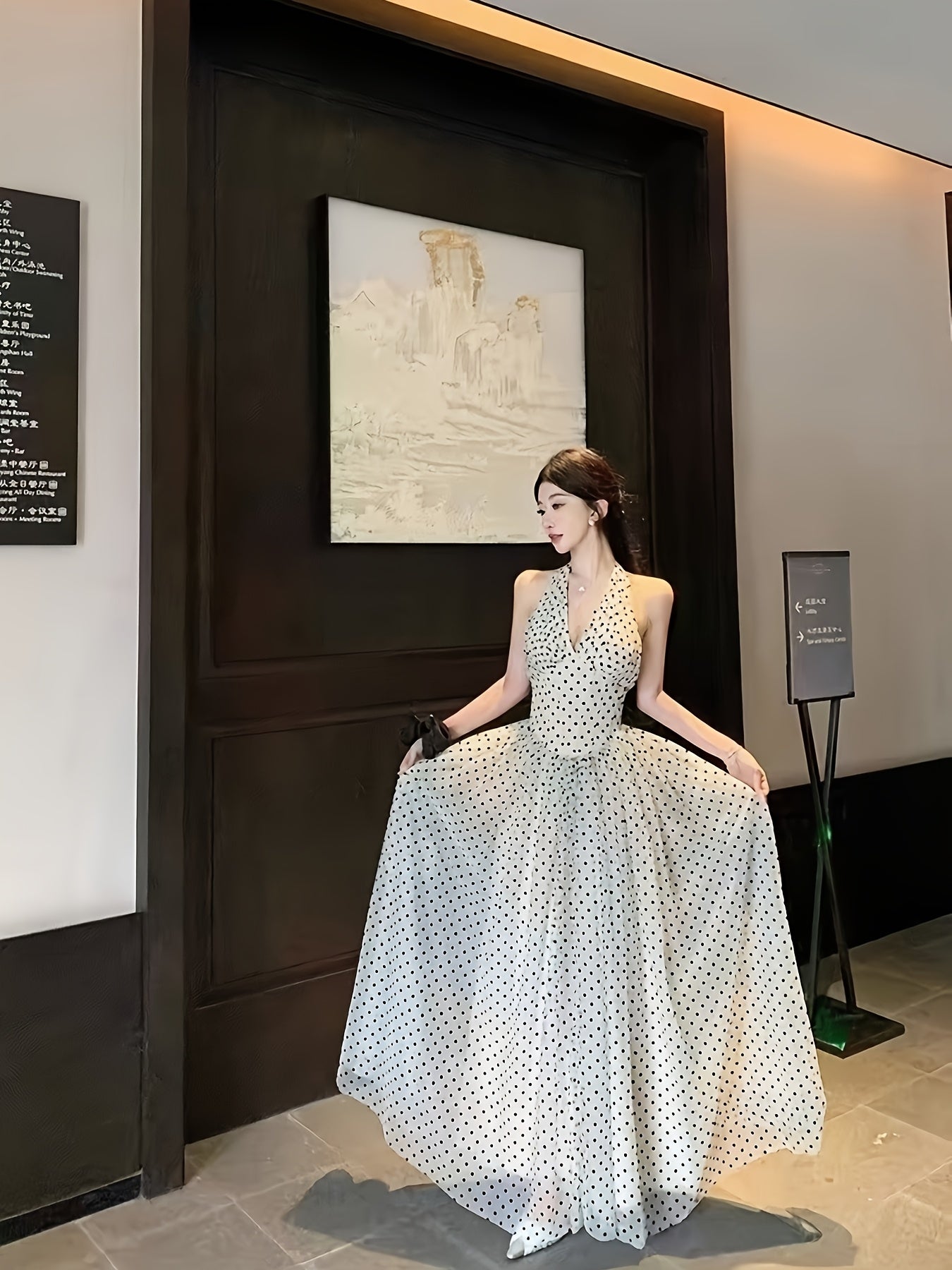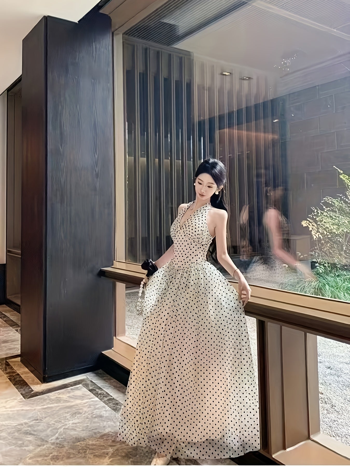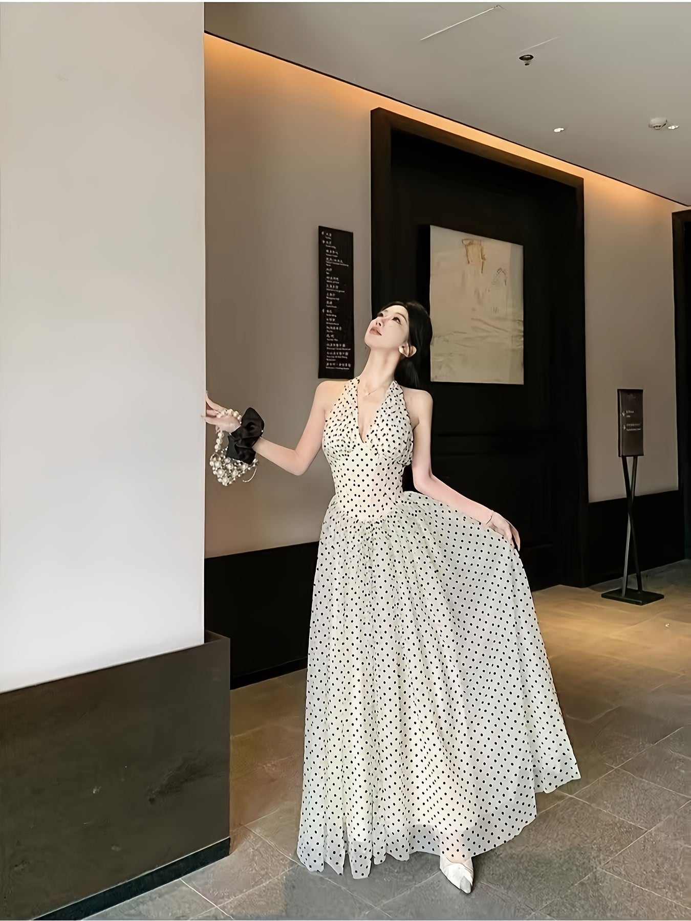 Women's Elegant Polka Dot V-Neck Halter Neck Dress - Backless Ruffled Hem, Fitted Top & Flowy Skirt, Lightweight Polyester, Machine Washable, All-Season Vacation & Formal Wear