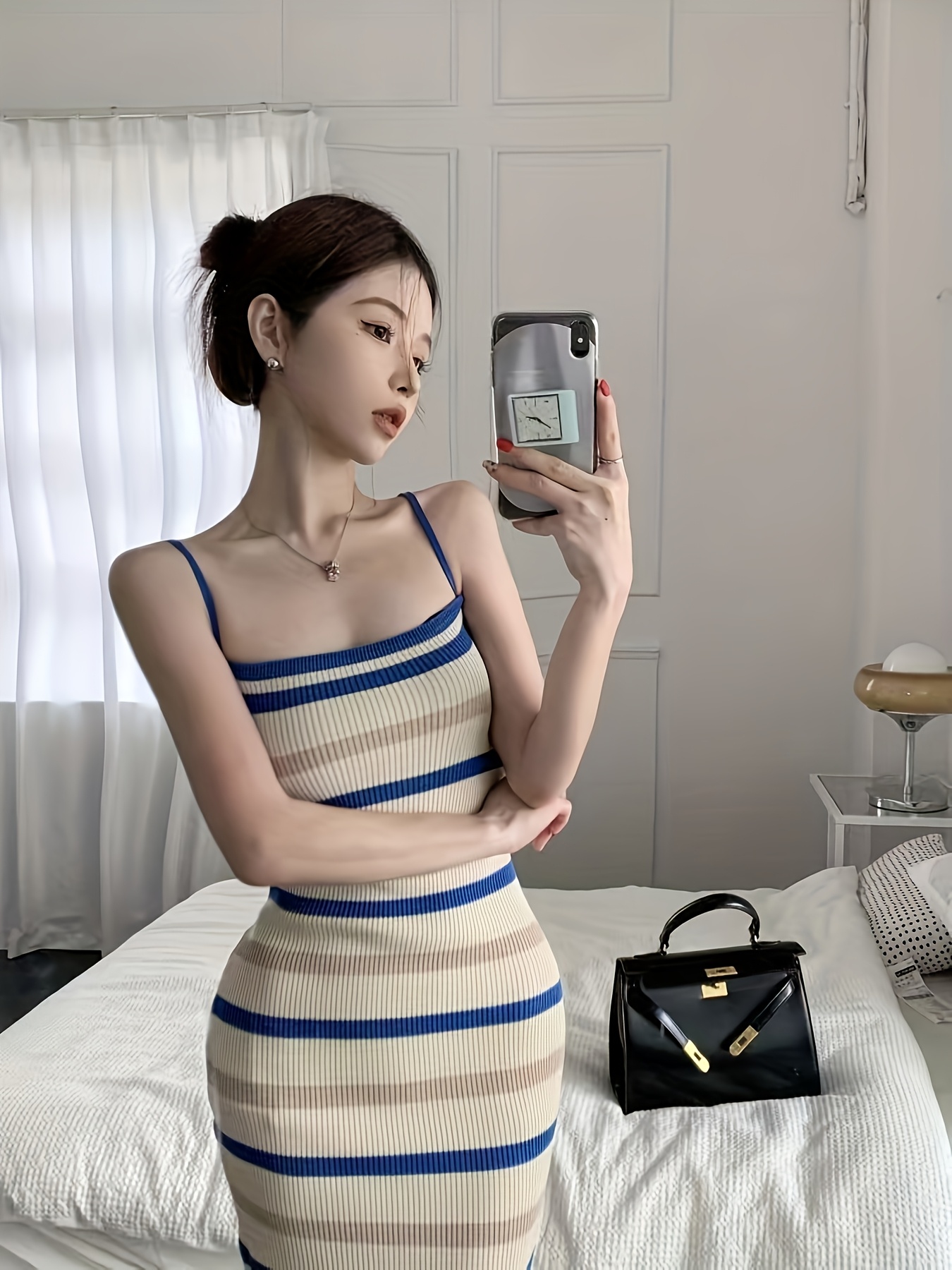 Women's French Striped Midi Dress - Strapless\u002FOne-Shoulder Boat Neck A-Line Layering Dress, Beige\u002FNavy\u002FWhite Horizontal Stripes, All-Season Slip Dress or Outerwear, Hand Washable Casual to Elegant Blouse