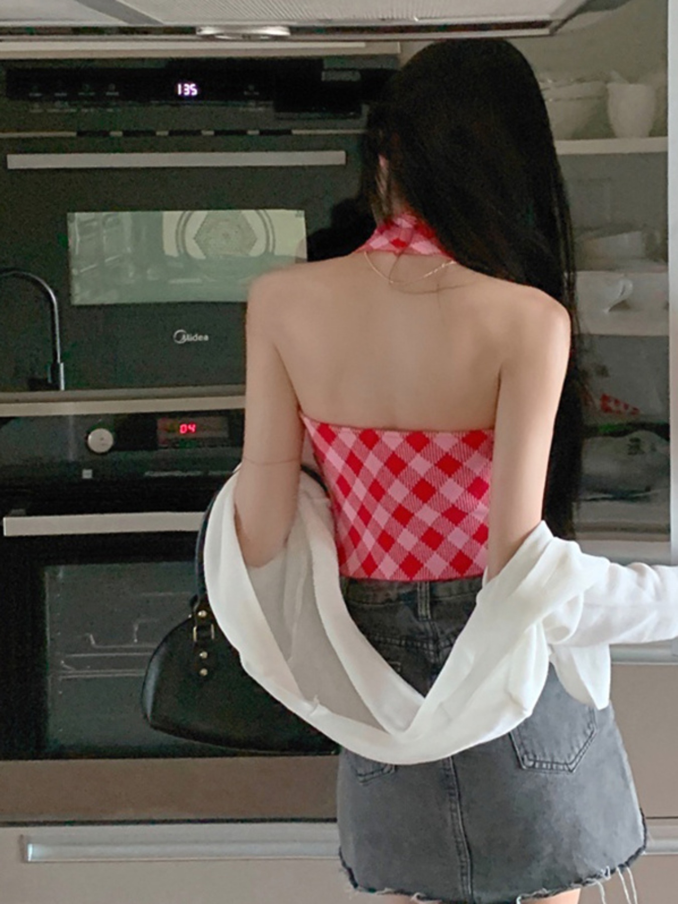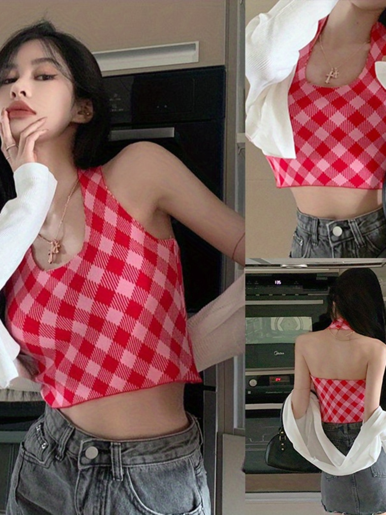Women's Red and White Gingham Halter Crop Top - Sleeveless, Backless, Asymmetrical Cut, Summer Streetwear Tank Top, Ladies Tank Tops