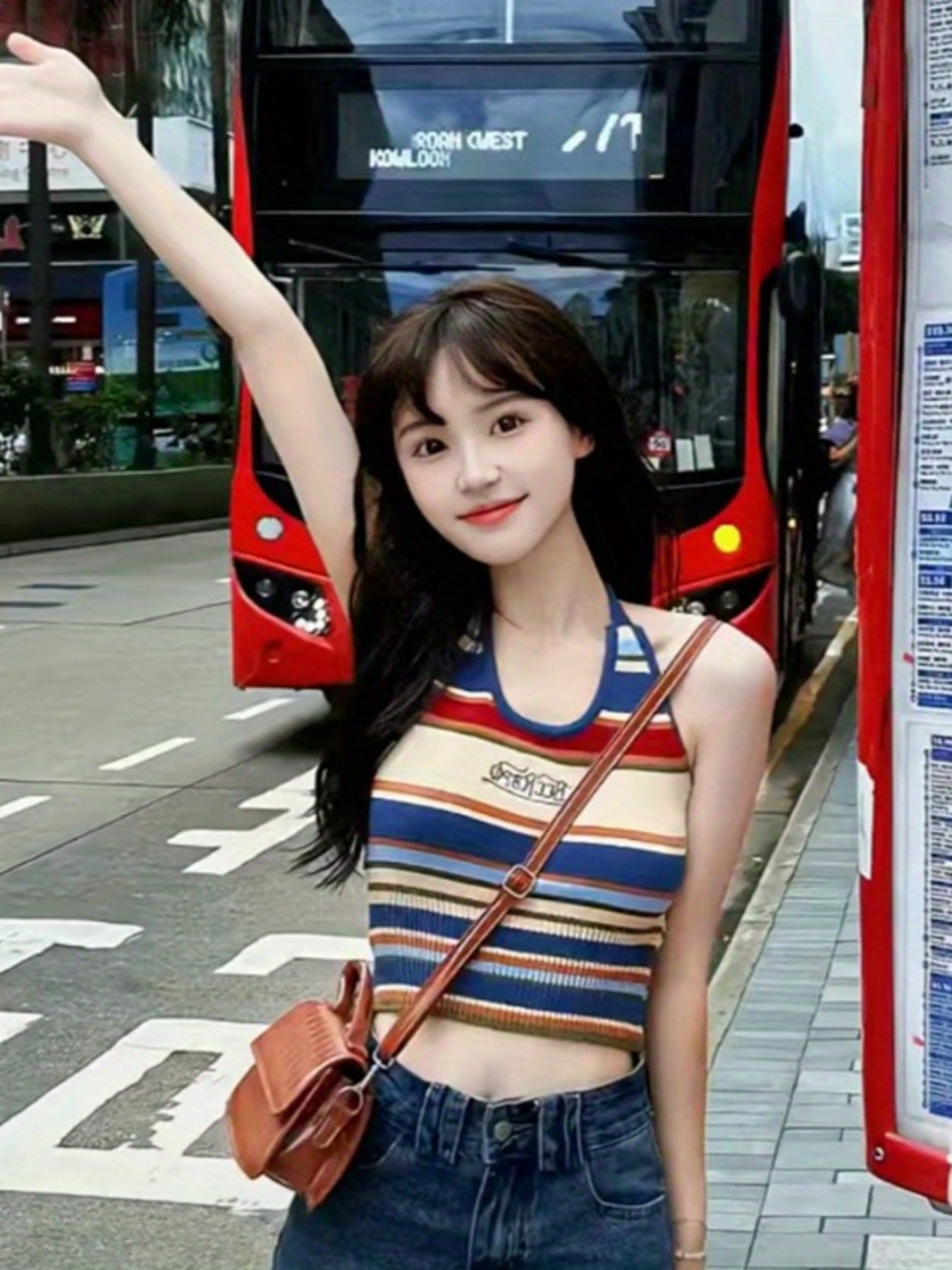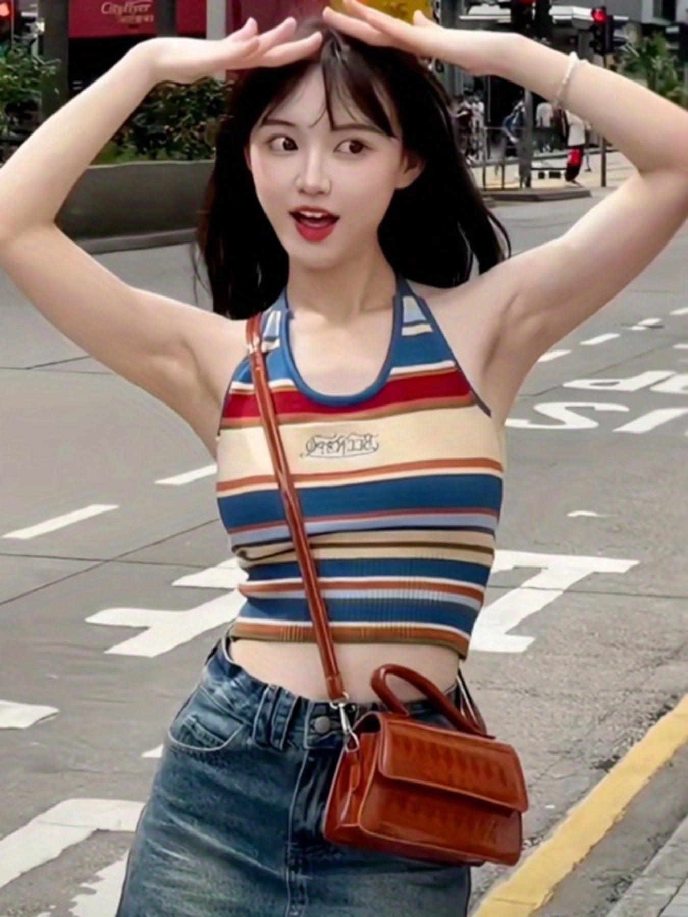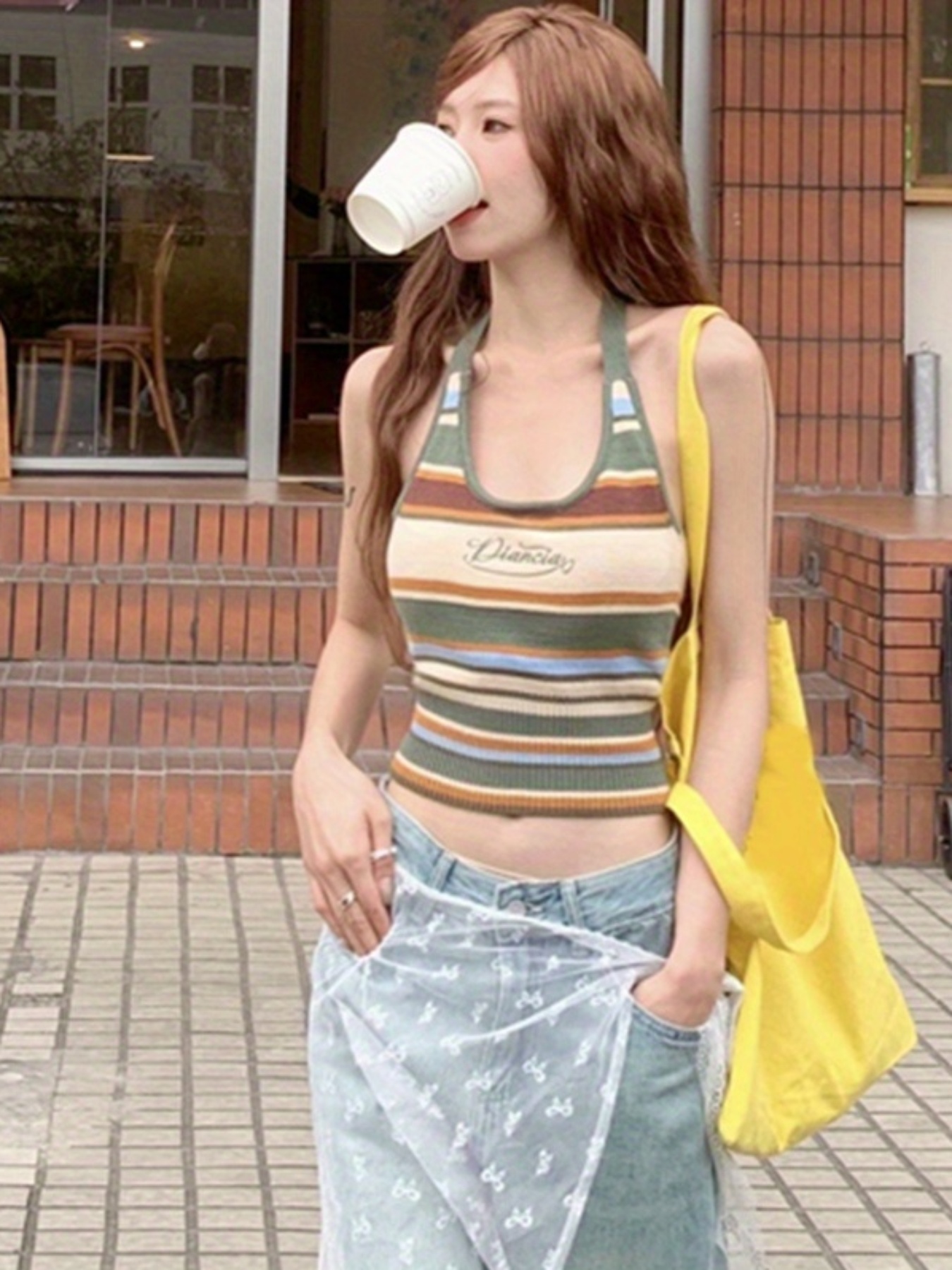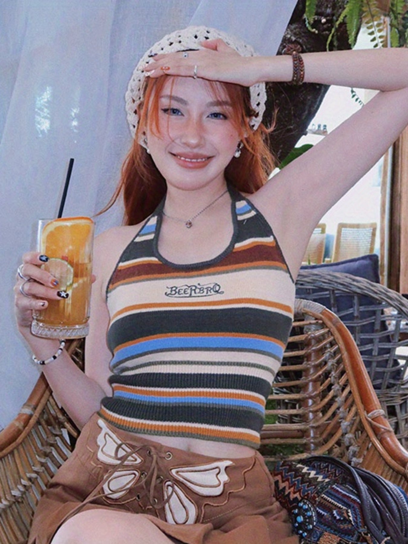 Women's Retro Halter Neck Cami Top - Open Back Knit Striped Tank with Multi-Color Block Design, Breathable Sleeveless Party & Casual Tops for Spring Summer Fall, Summer Fashion | Offshoulder Fashion | Soft Texture, Ladies Tank Tops