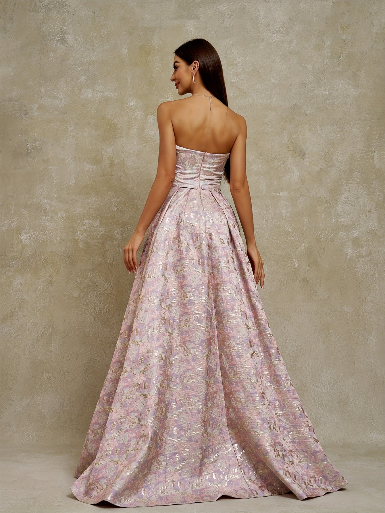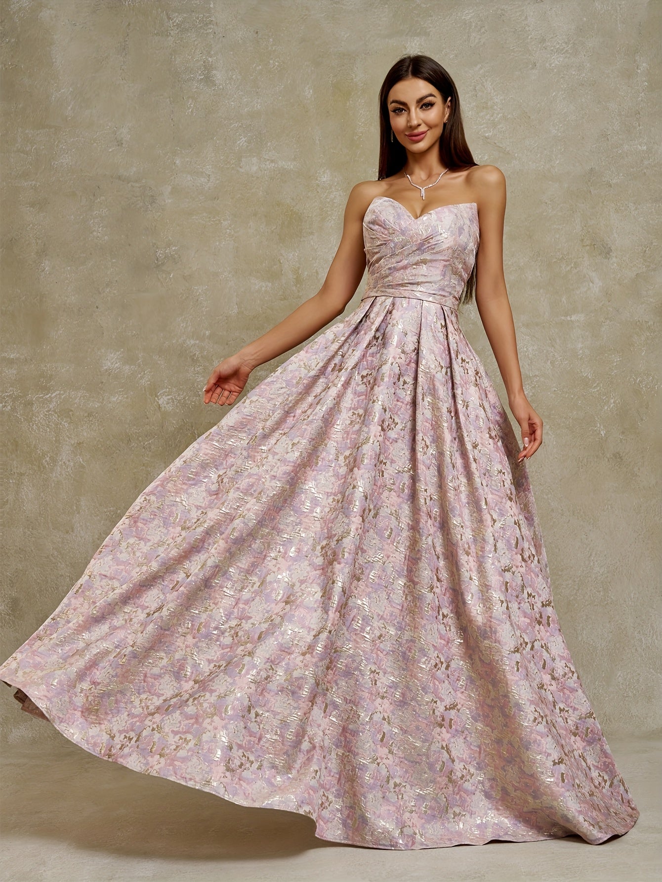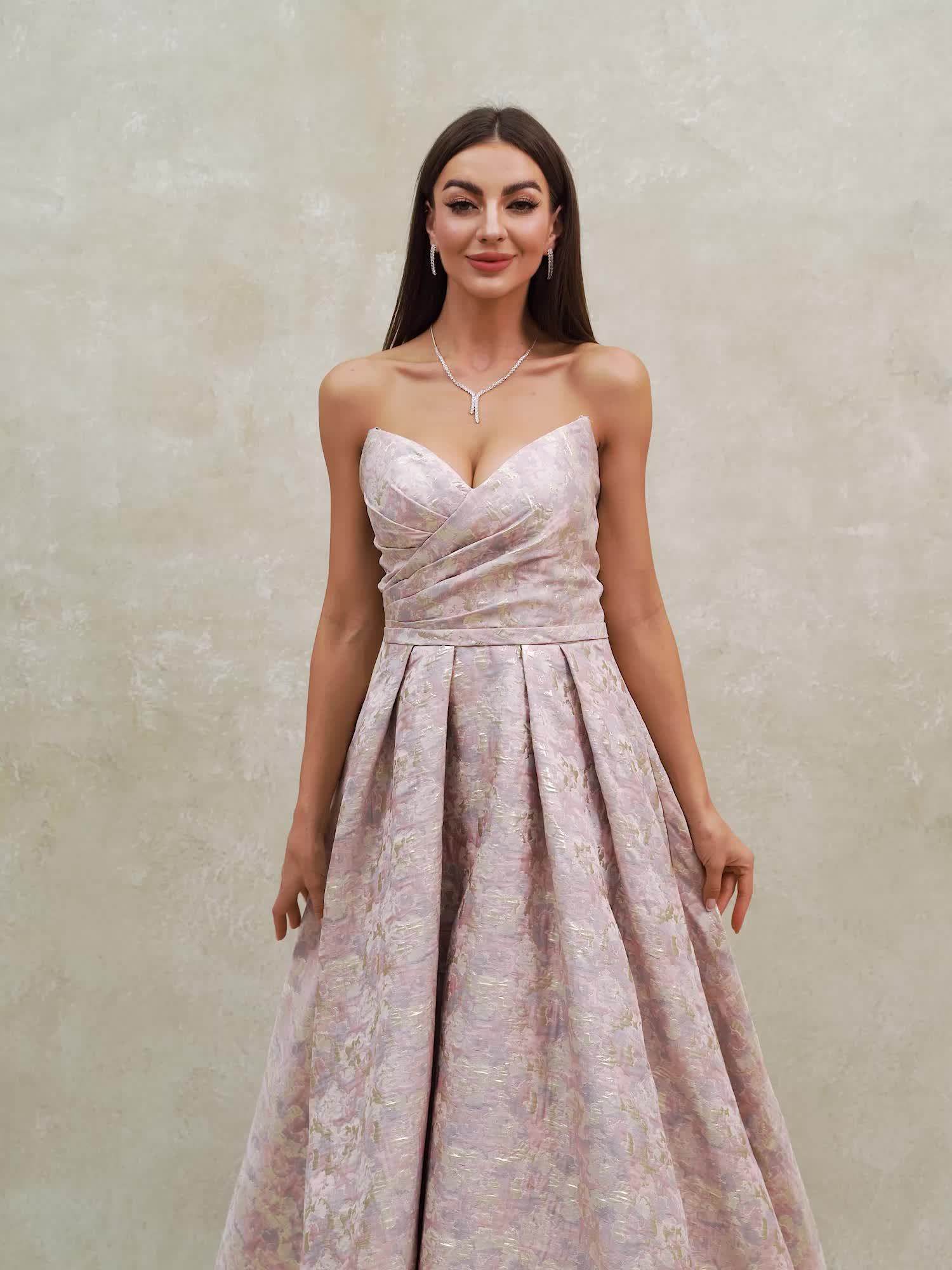 Women's Strapless Geometric Jacquard Evening Gown with Ruffled Hem - Elegant Fitted Top & Flowy Skirt, Hand Wash Only, Perfect for Weddings, Galas, Formal Parties & Family Dinners, Formal Evening Gown